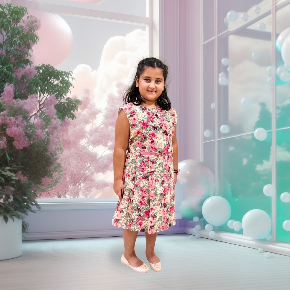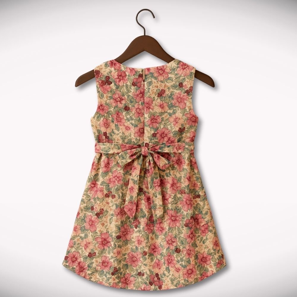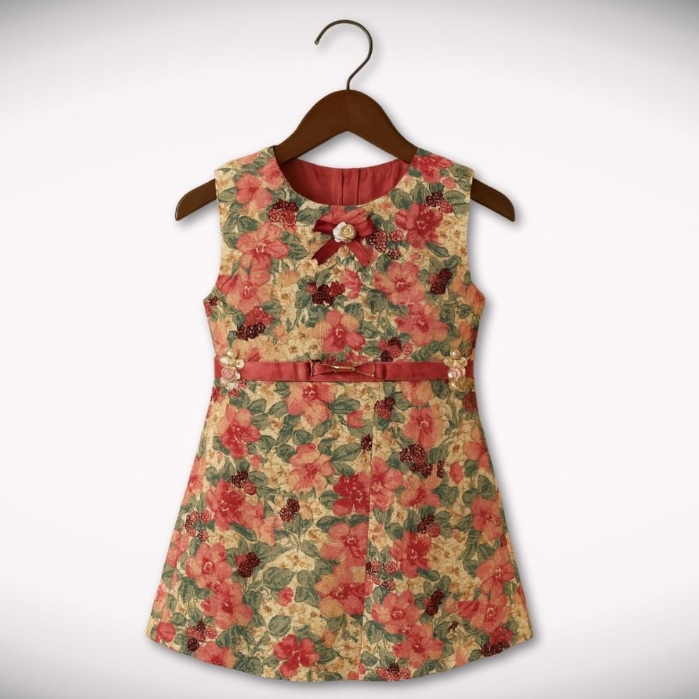 Delight in effortless style with this fit and flare party wear dress for girls, crafted from floral corduroy with a soft cotton lining for breathable comfort. Its round neckline and sleeveless design make it perfect for both everyday elegance and festive occasions.