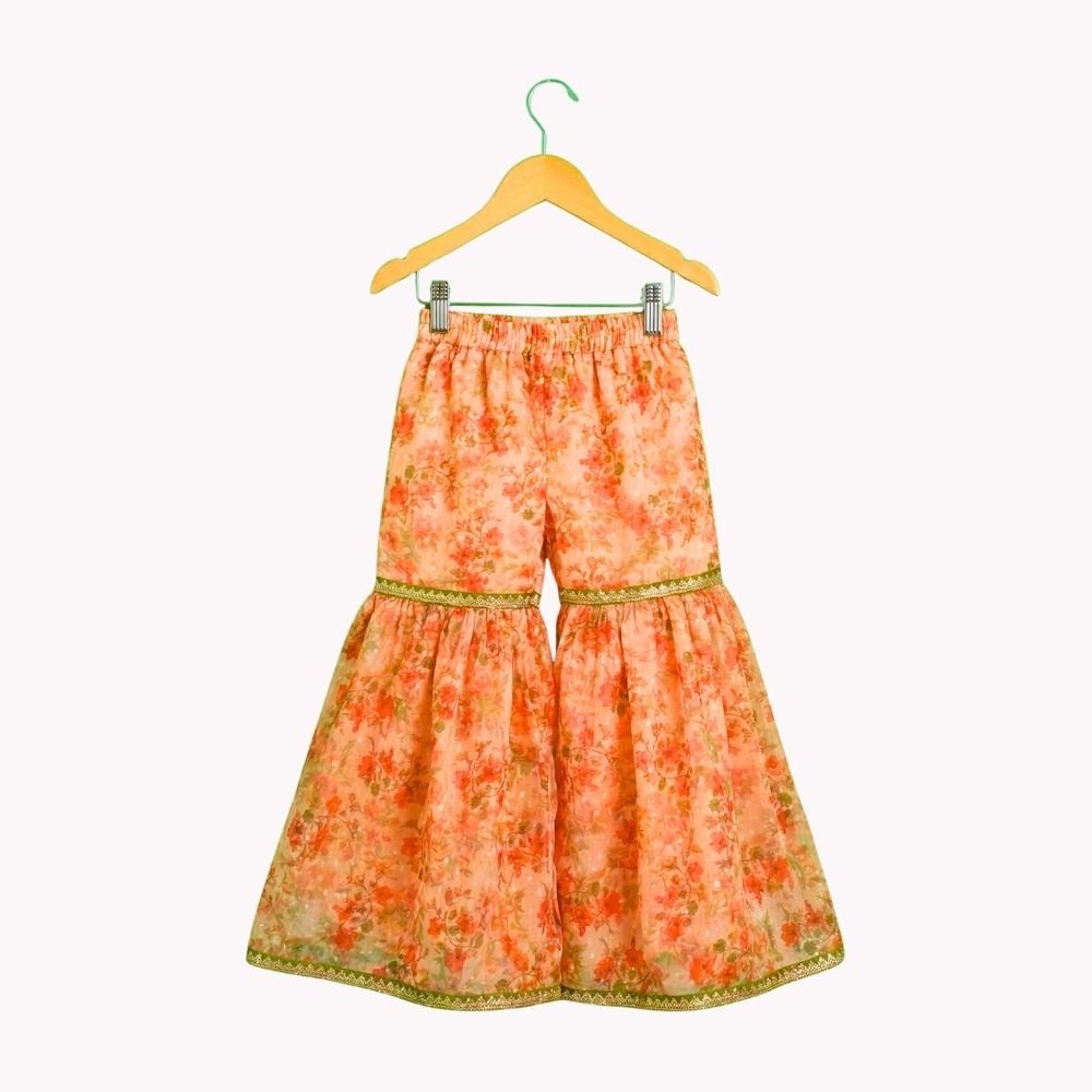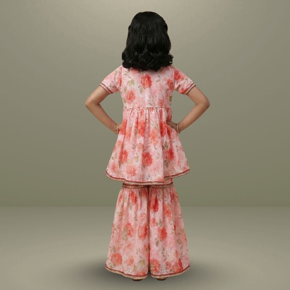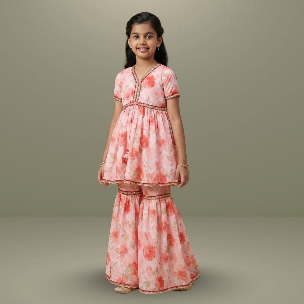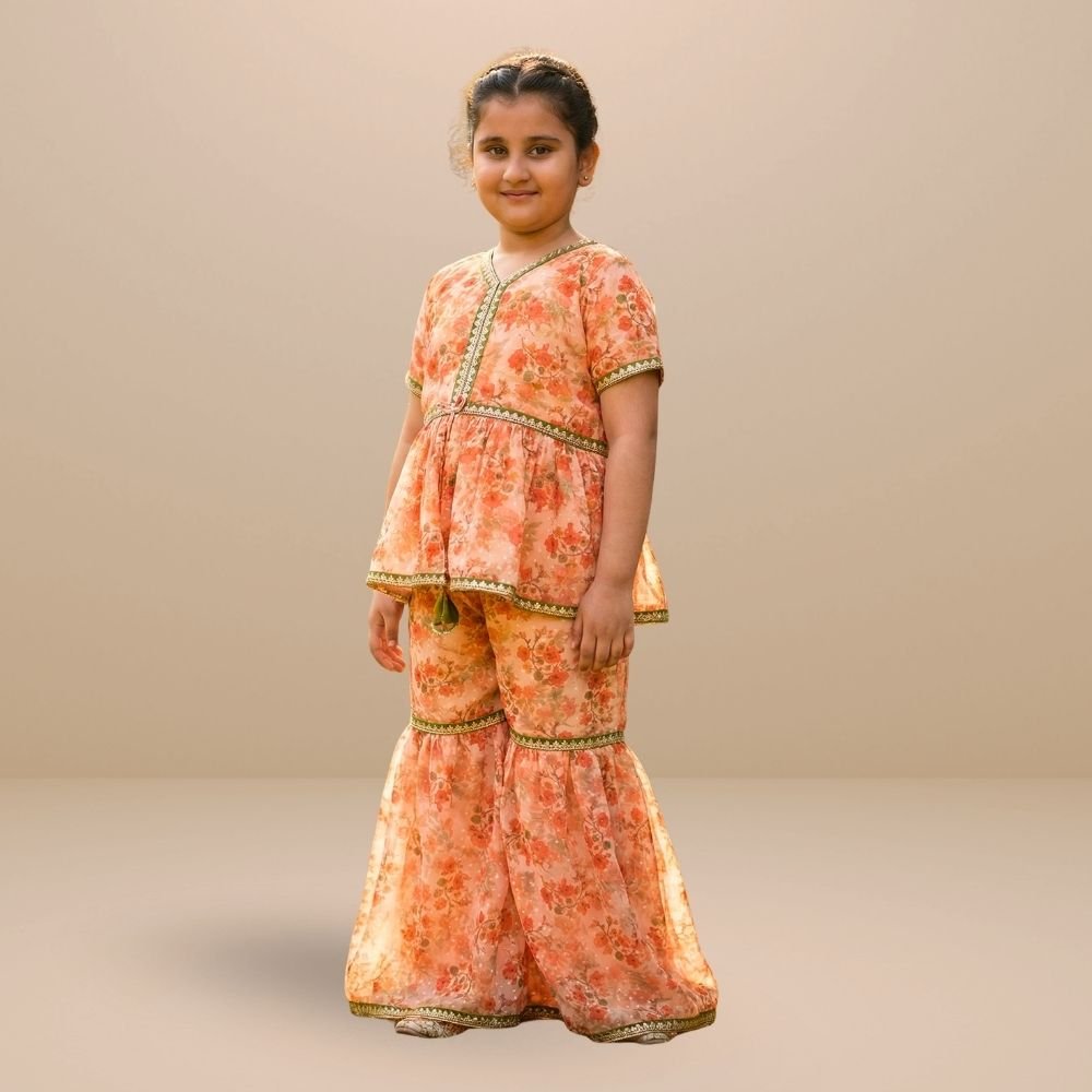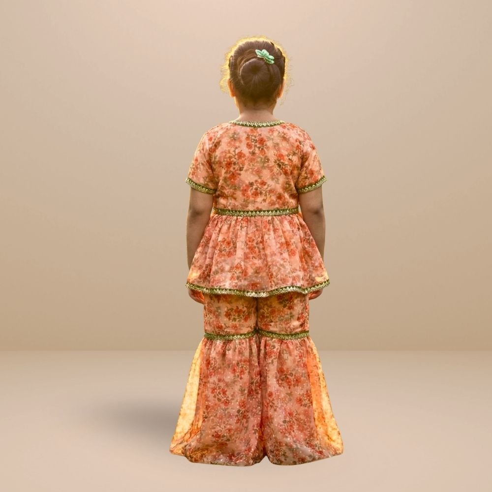 Bright and playful, this kids’ co-ord set features a floral georgette peplum top paired with garara pants for a festive yet comfortable look. The flowy silhouette allows easy movement.