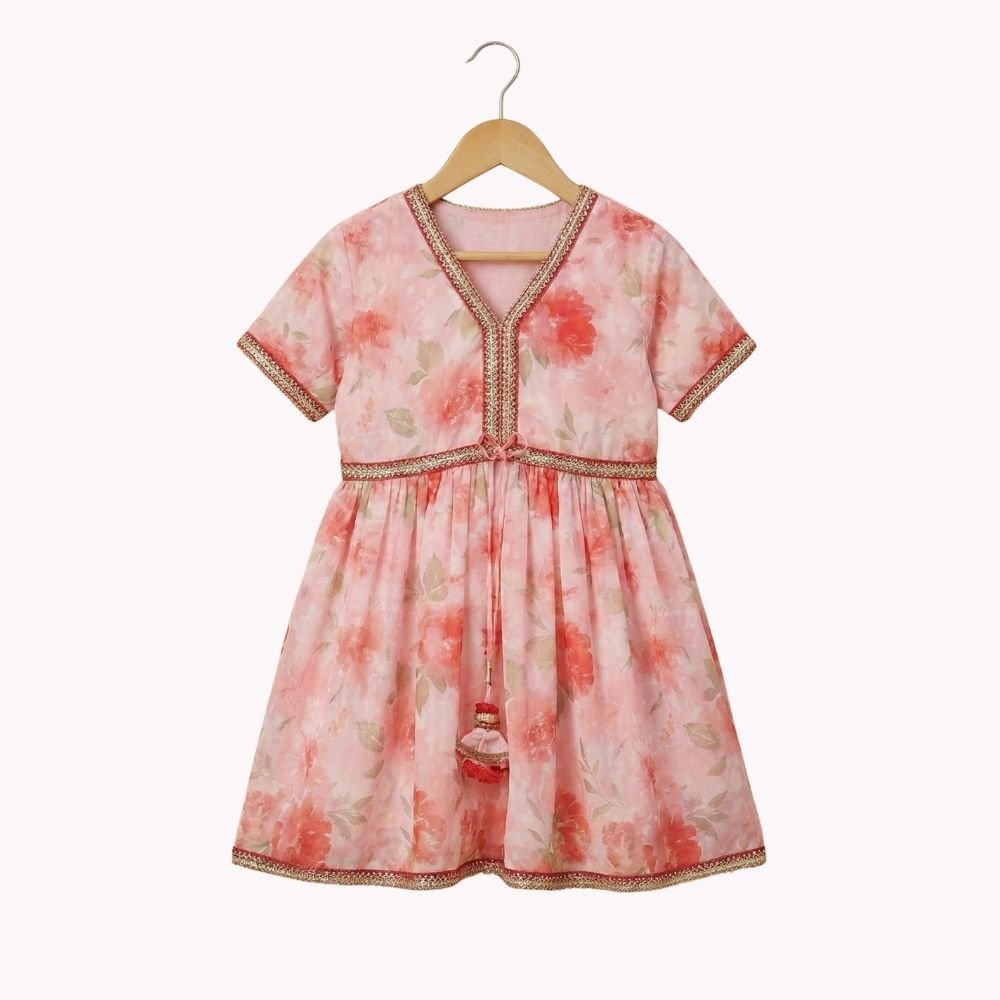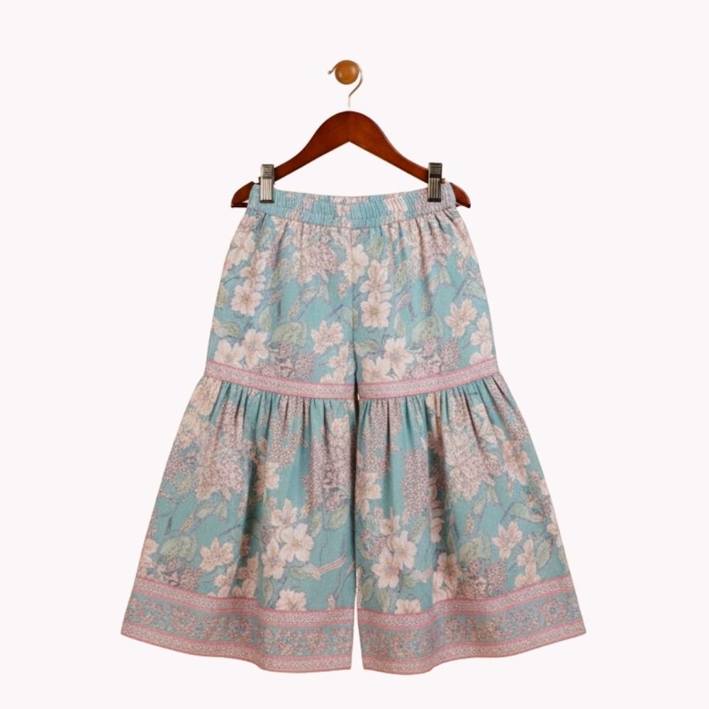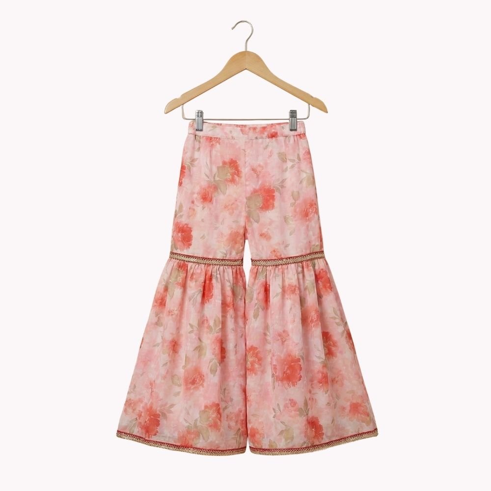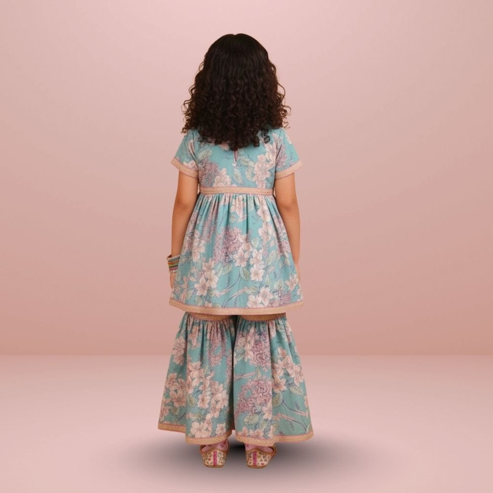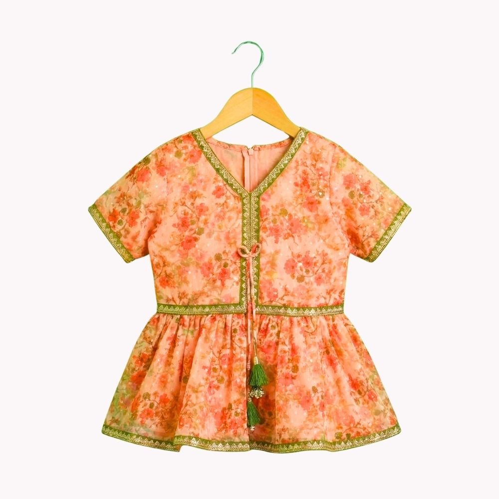 Bright and playful, this kids’ co-ord set features a floral georgette peplum top paired with garara pants for a festive yet comfortable look. The flowy silhouette allows easy movement.