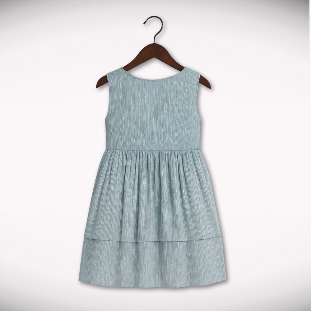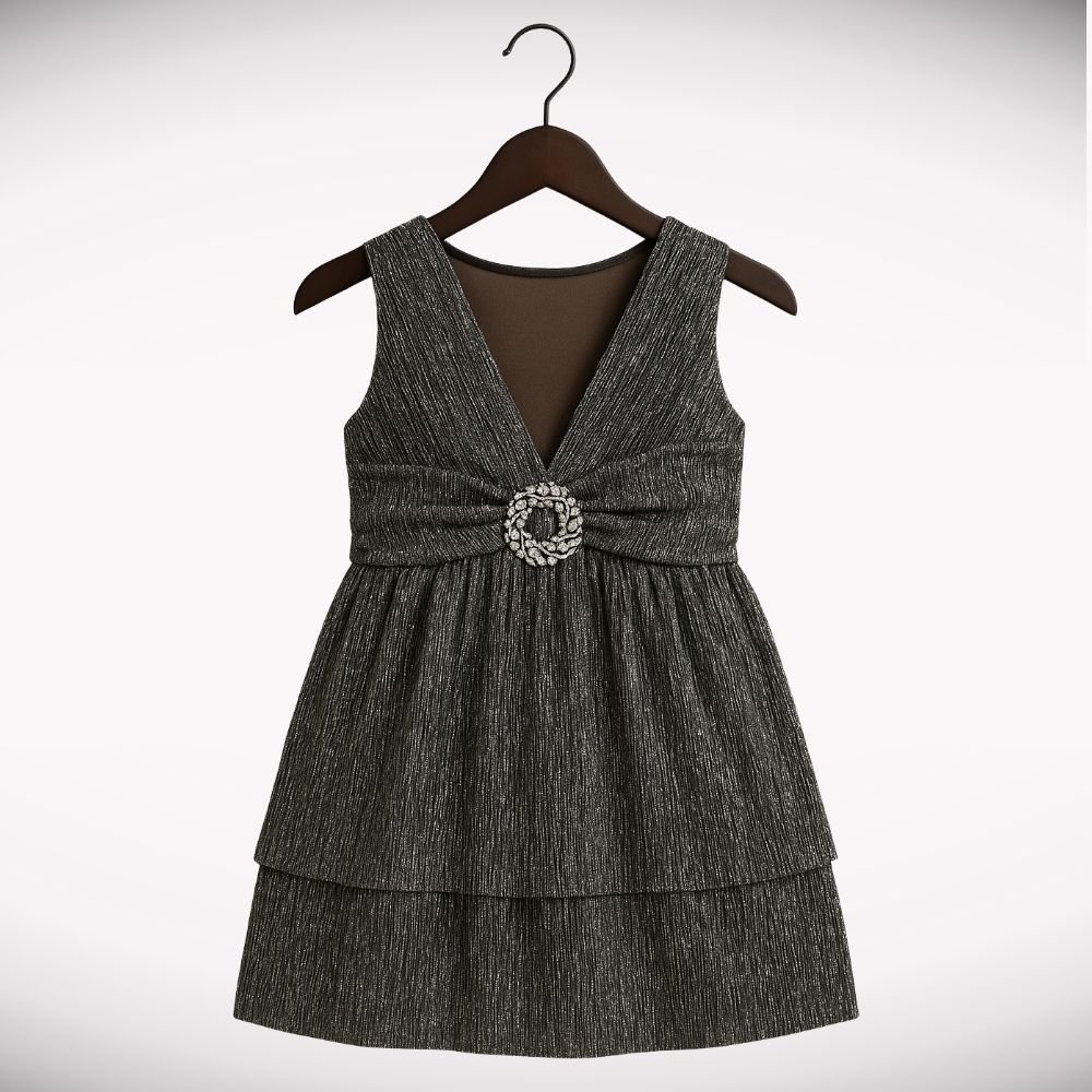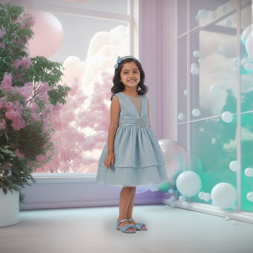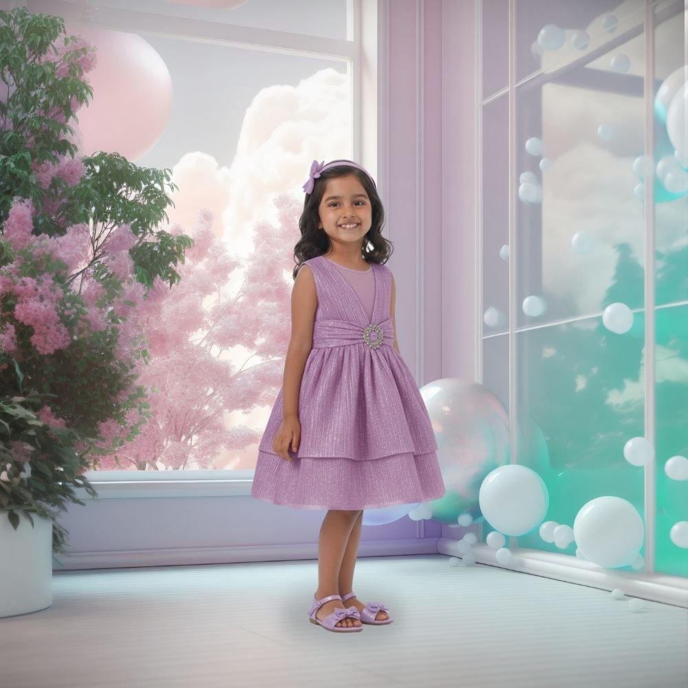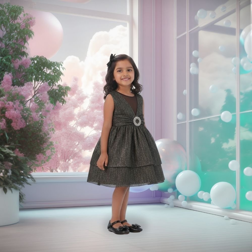 Shimmer meets sophistication in this fit & flare party wear dress for girls, crafted in moonlight georgette with butter crepe lining. The tiered skirt with detachable can-can allows versatile styling, while the removable rhinestone buckle adds just the right touch of sparkle.