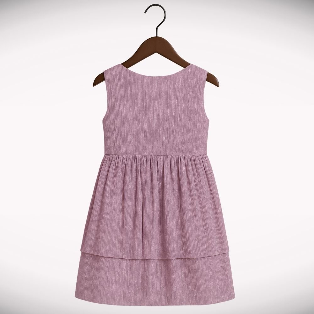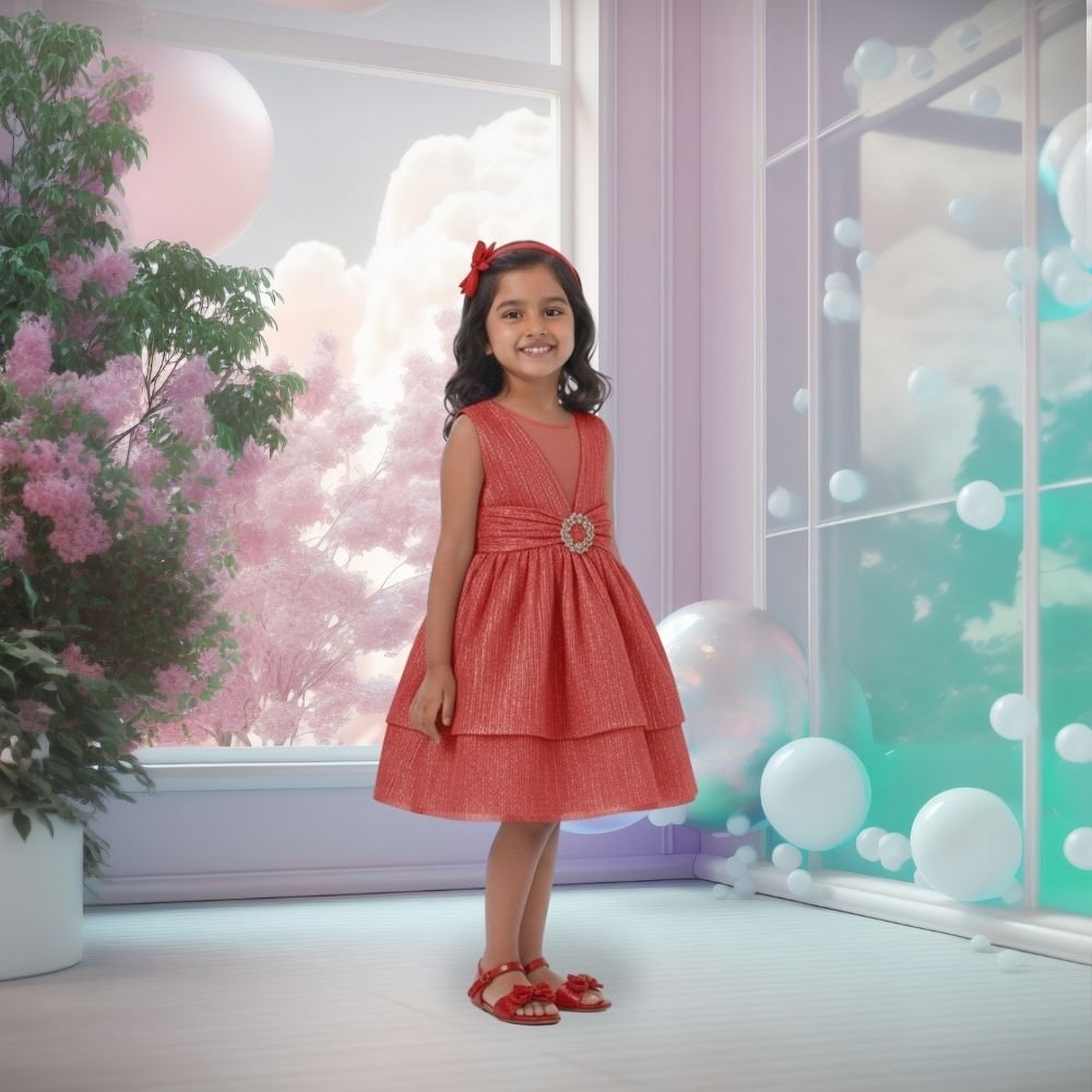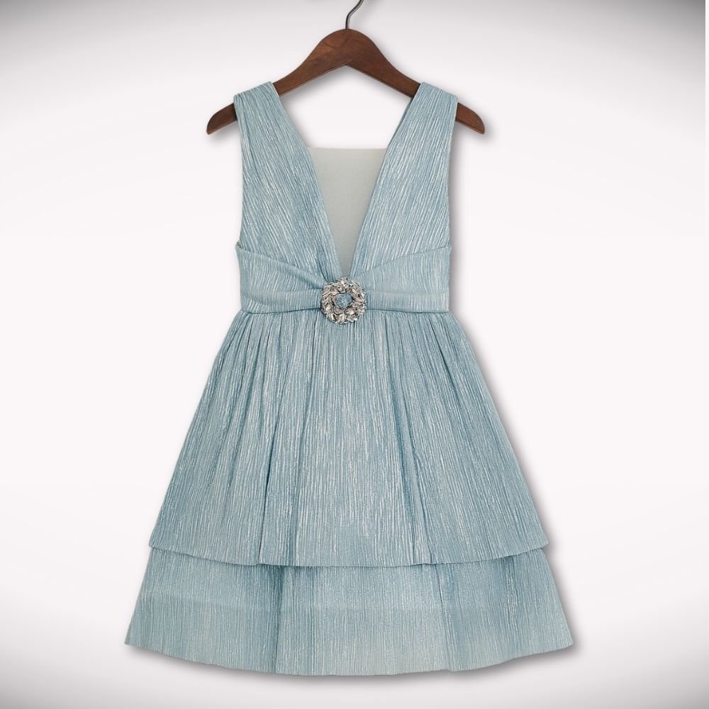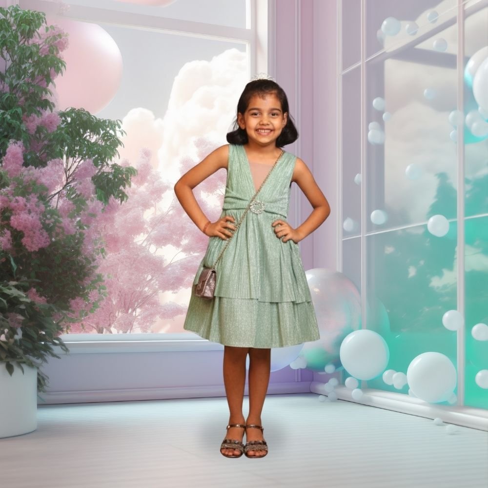Shimmer meets sophistication in this fit & flare party wear dress for girls, crafted in moonlight georgette with butter crepe lining. The tiered skirt with detachable can-can allows versatile styling, while the removable rhinestone buckle adds just the right touch of sparkle.