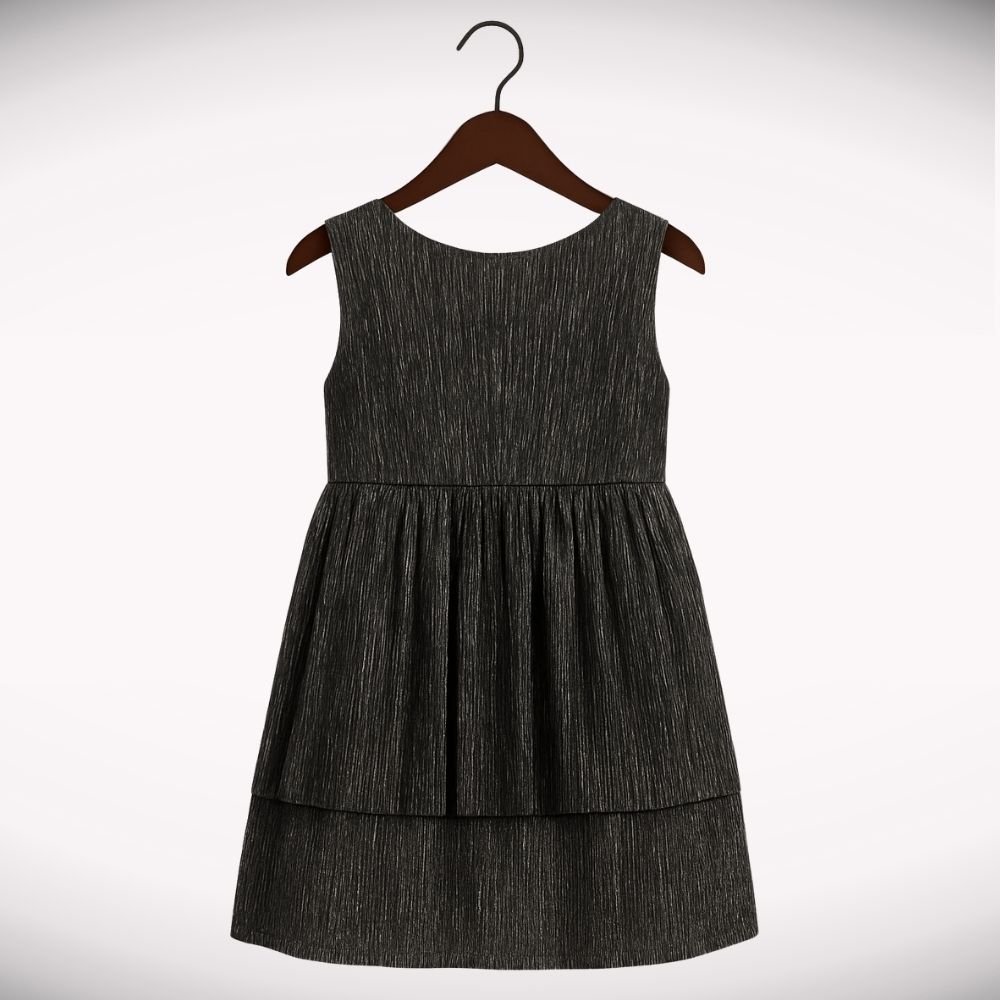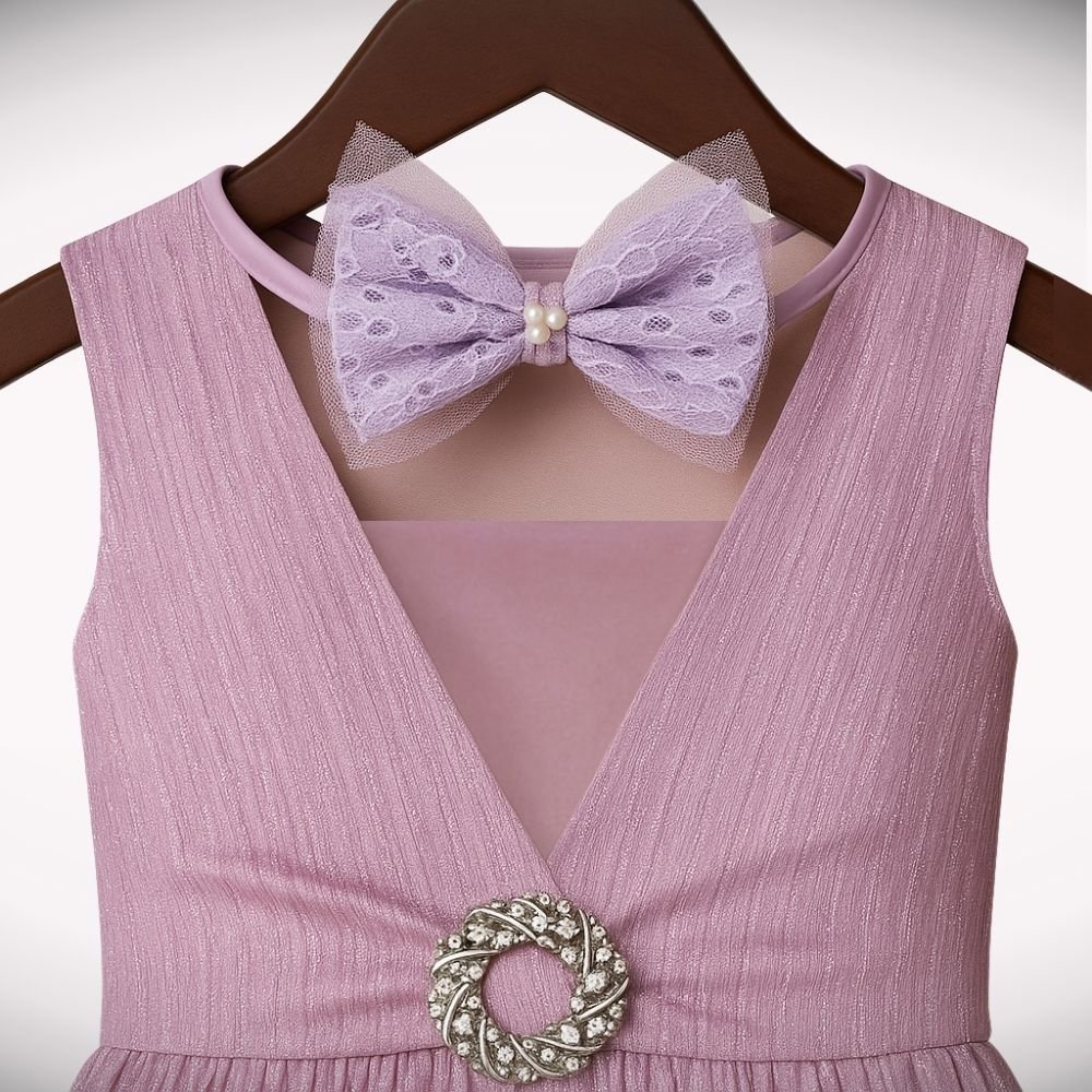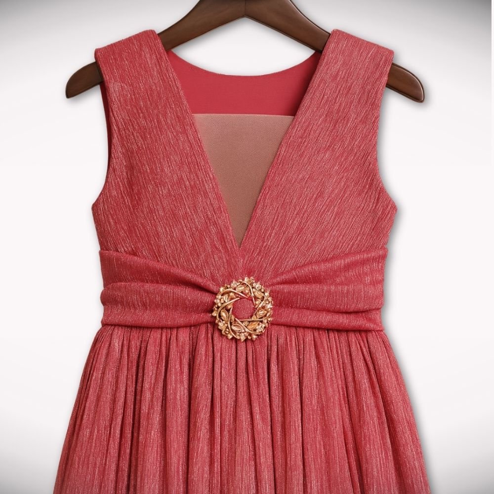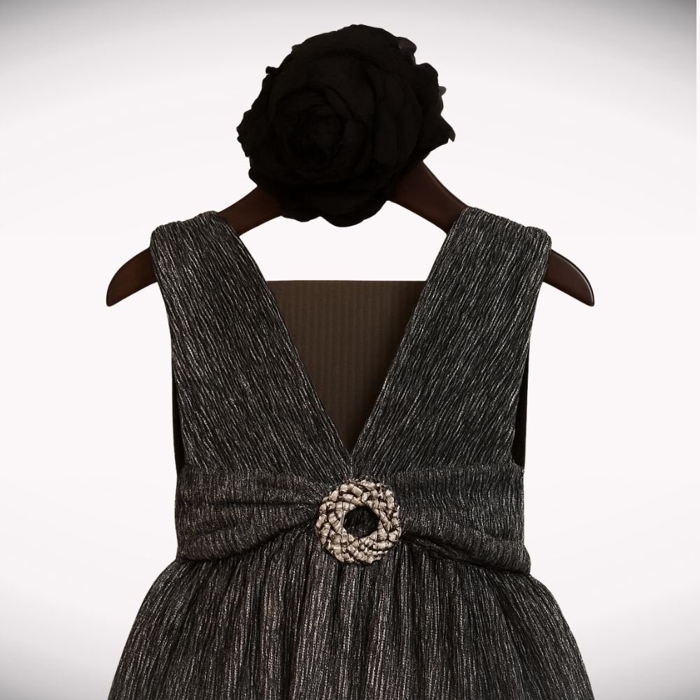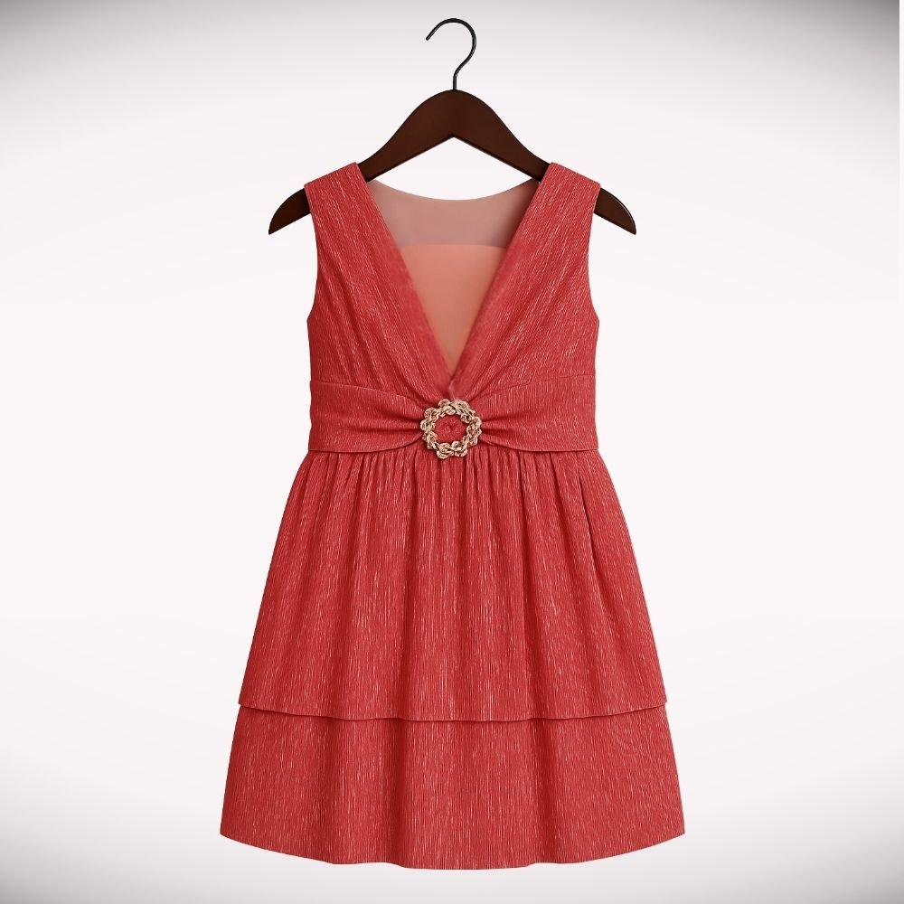 Shimmer meets sophistication in this fit & flare party wear dress for girls, crafted in moonlight georgette with butter crepe lining. The tiered skirt with detachable can-can allows versatile styling, while the removable rhinestone buckle adds just the right touch of sparkle.