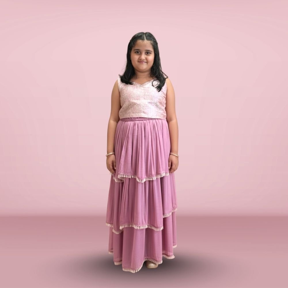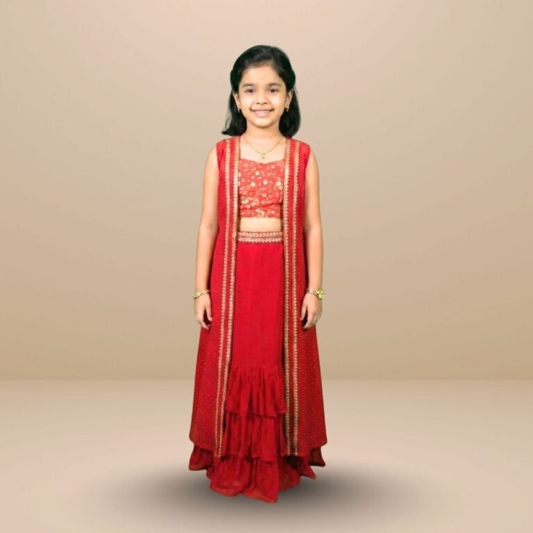 Make festive dressing fun and fuss-free with this kids’ pre-draped saree set, designed for easy wear and all-day comfort. It features a soft georgette frill skirt with an embroidered pre-stitched pallu that gives a traditional saree look without the hassle of draping.