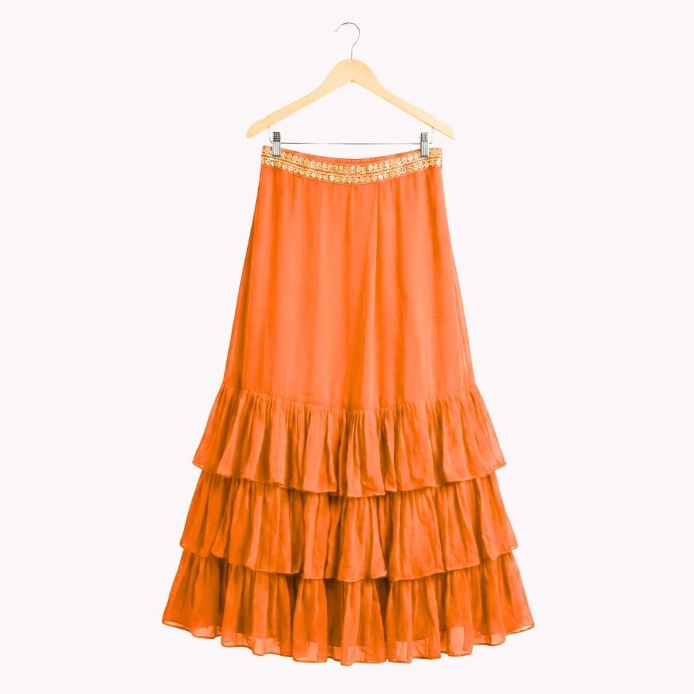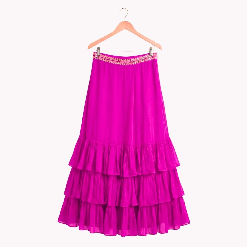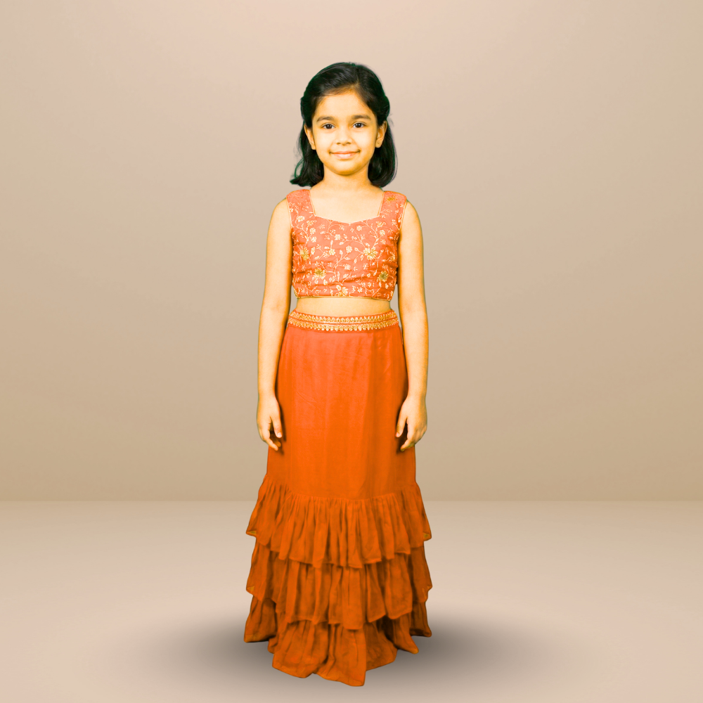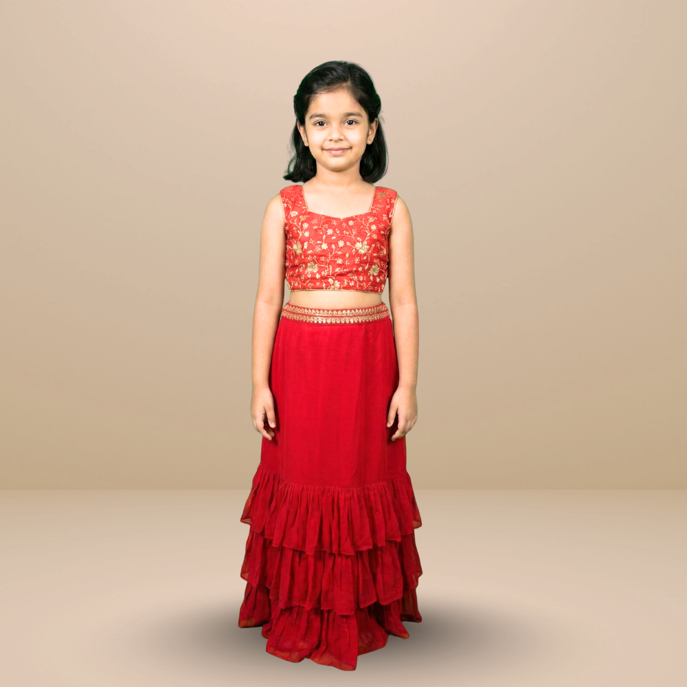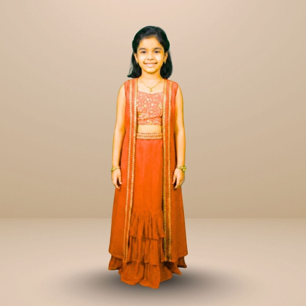Vibrant and festive, this kids’ lehenga & jacket set features a georgette frill skirt paired with an embroidered silk blouse for a rich traditional feel. The bordered georgette jacket adds a stylish layer.