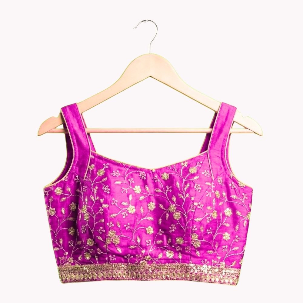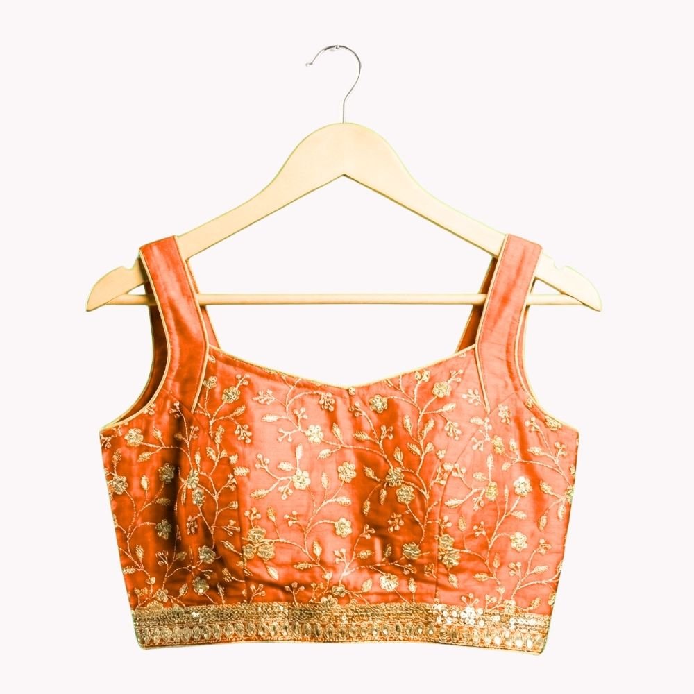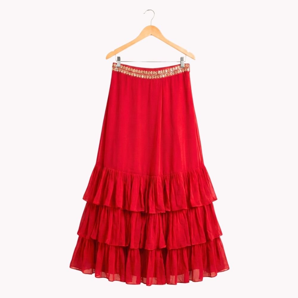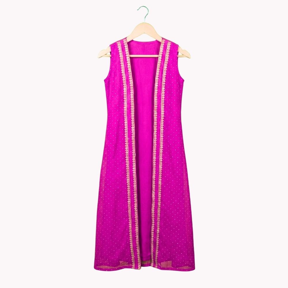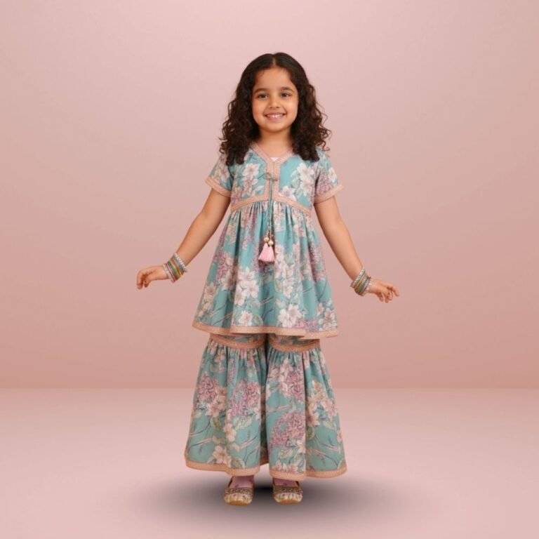 Vibrant and festive, this kids’ lehenga & jacket set features a georgette frill skirt paired with an embroidered silk blouse for a rich traditional feel. The bordered georgette jacket adds a stylish layer.